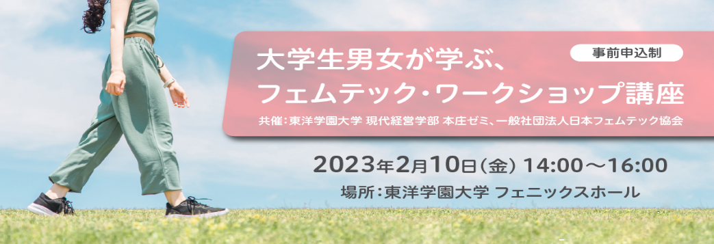 一般社団法人日本フェムテック協会(代表理事:山田奈央子・関口由紀、所在地:東京都港区、HP:https://j-femtech.com 、以下当協会)は、2023年2月19日(日)の“フェムテックを学ぶ日”に先駆けて、2月10日(金)に東洋学園大学と『大学生男女が学ぶ、フェムテック・ワークショップ講座』を共催いたします。