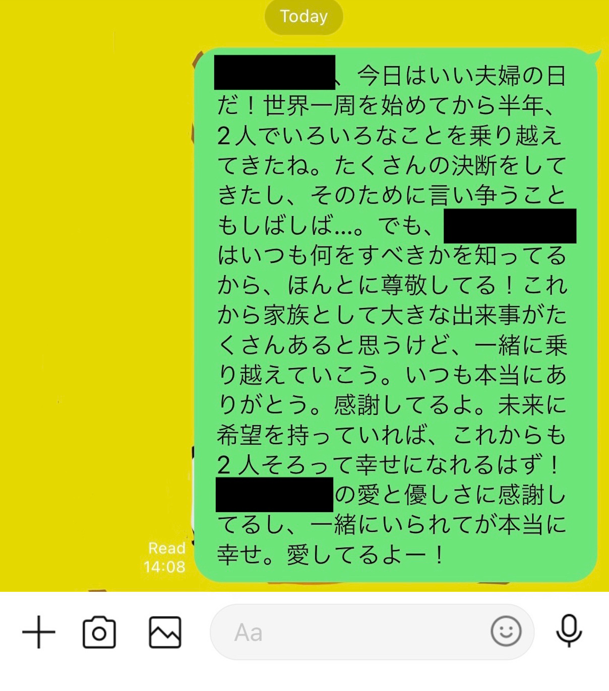 ▼夫婦で世界一周をしている男性から、妻へのメッセージ