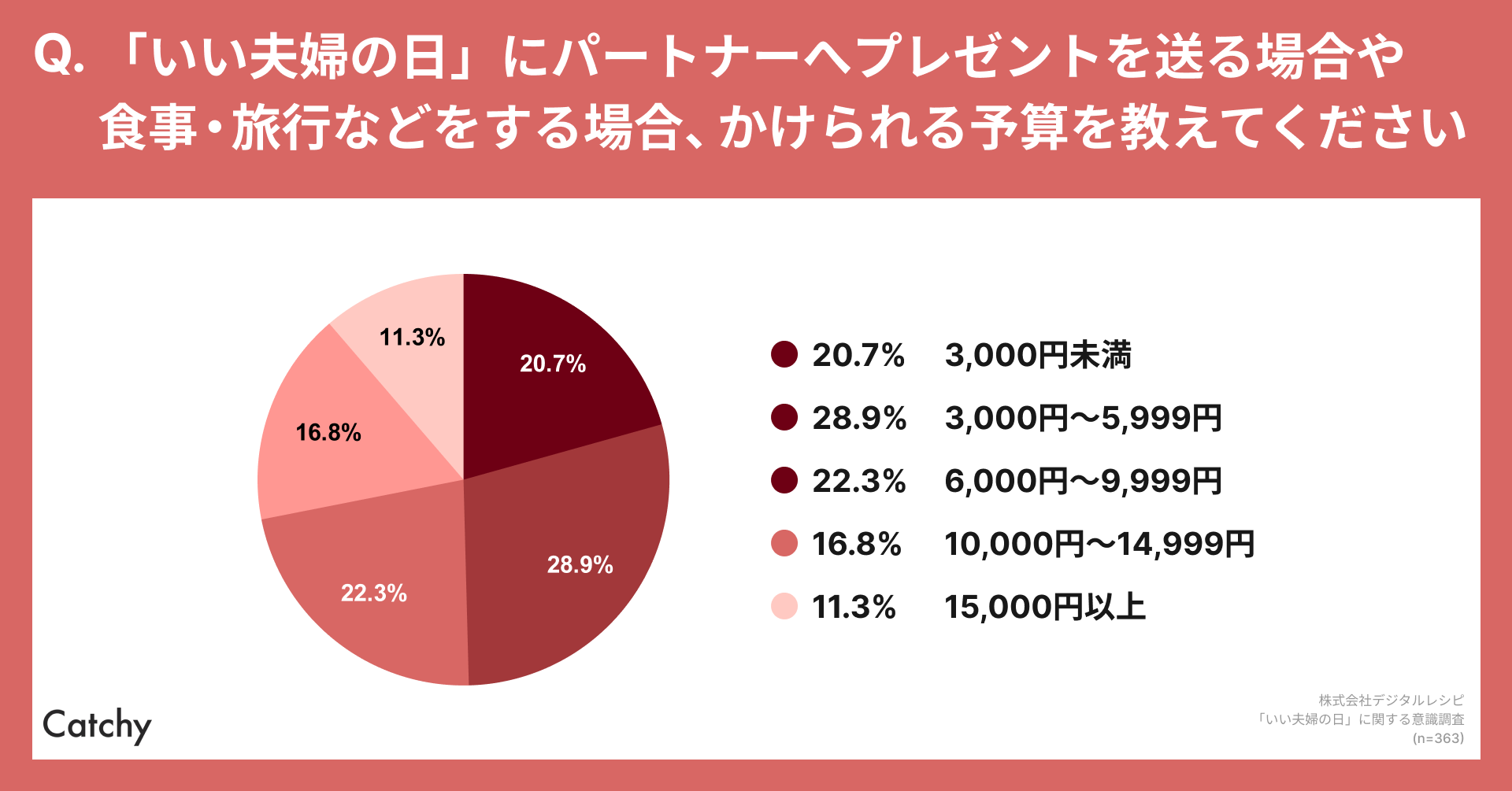 また、いい夫婦の日にかけられる予算を質問したところ、「3,000円〜5,999円(28.9%)」の回答が一番多く、次が「6,000円〜9,999円(22.3%)」という結果になりました。