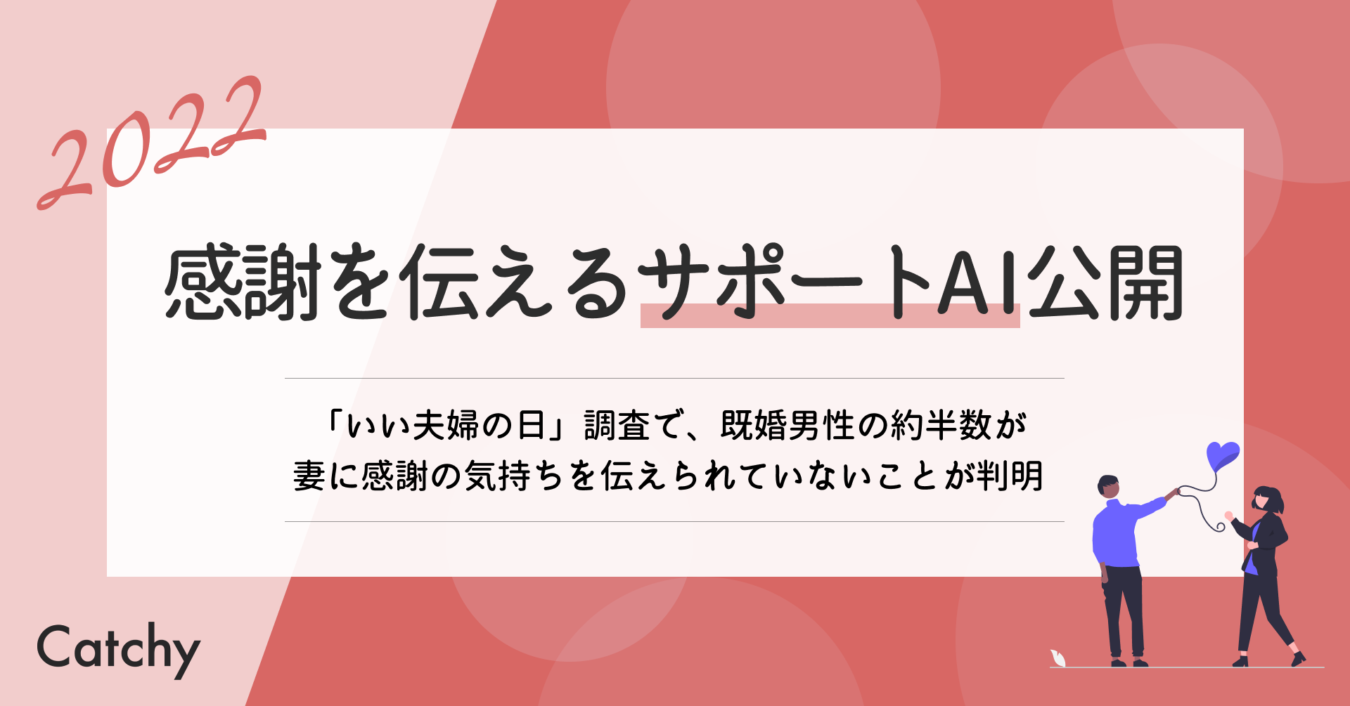 AIライティングアシスタントサービスのCatchyが、「いい夫婦の日」に合わせてパートナーに感謝を伝えるための文章作成ツールをリリース。普段は感謝の気持ちを伝えられない口下手な方をお手伝いします。