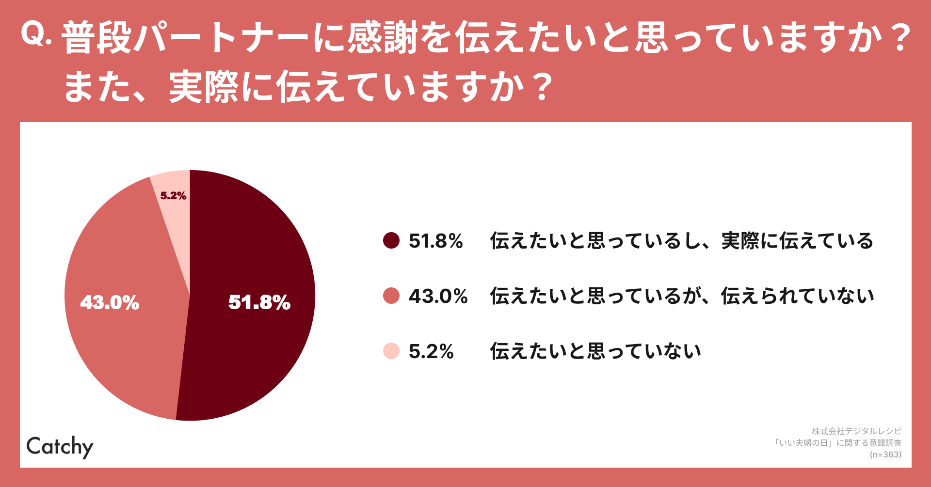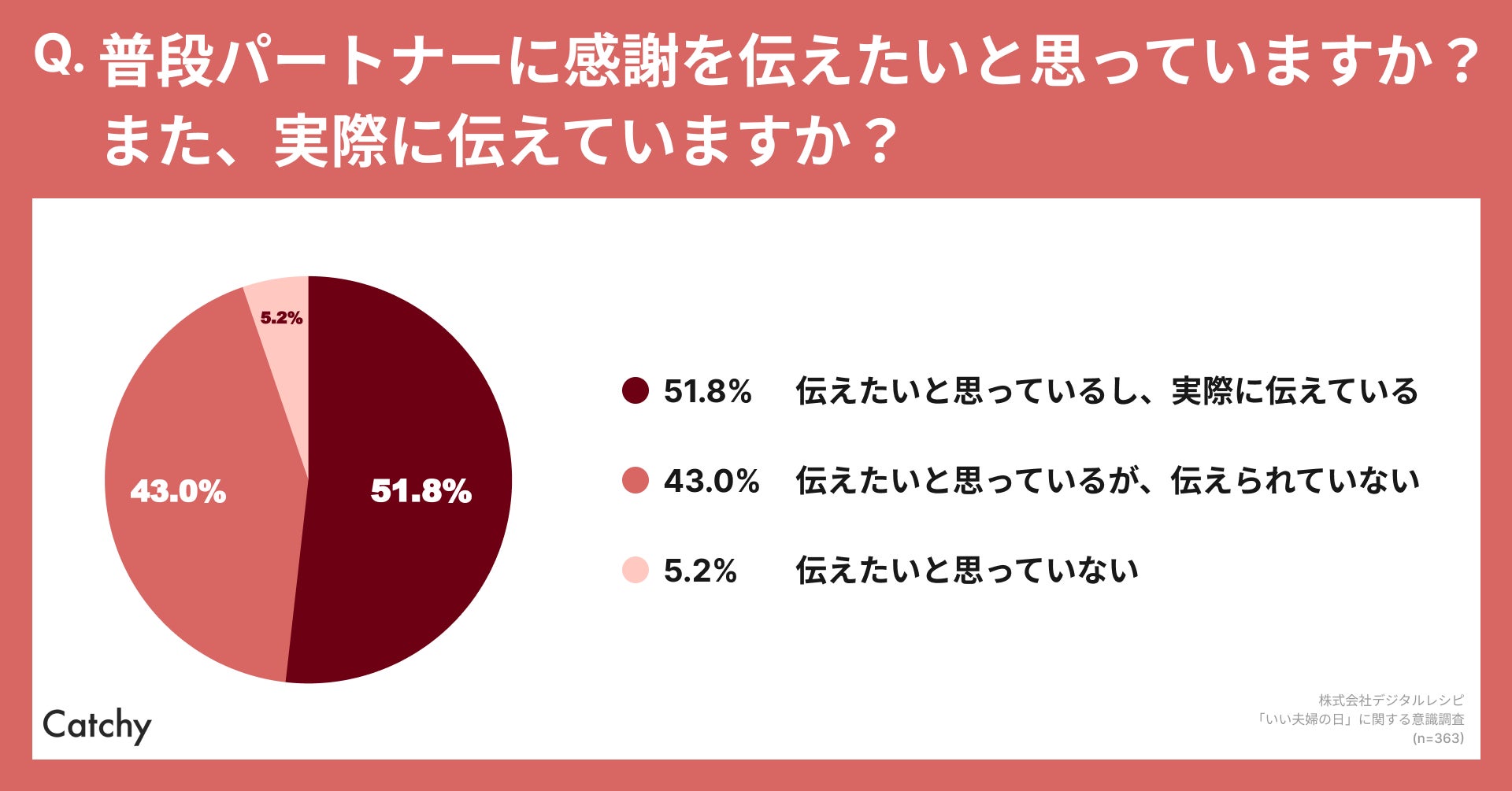 「あなたは普段パートナーに感謝を伝えたいと思っていますか?また、実際に伝えていますか? 」(n=363)と質問したところ、約43.0%が「普段パートナーに感謝を伝えたいと思っている一方、実際には伝えられない」と回答しました。