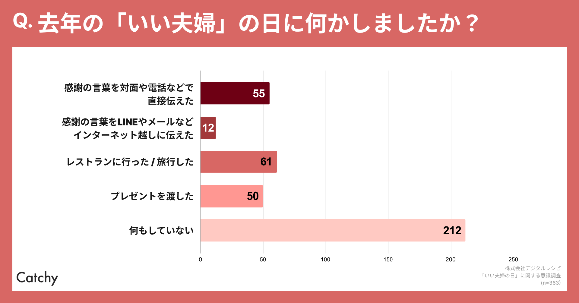 「去年のいい夫婦の日になにかしましたか?」と質問したところ、「何もしていない」と答えた男性が半数以上(212名・約58%)となりました。