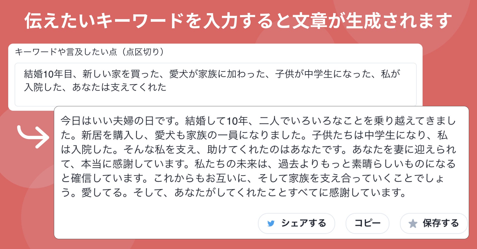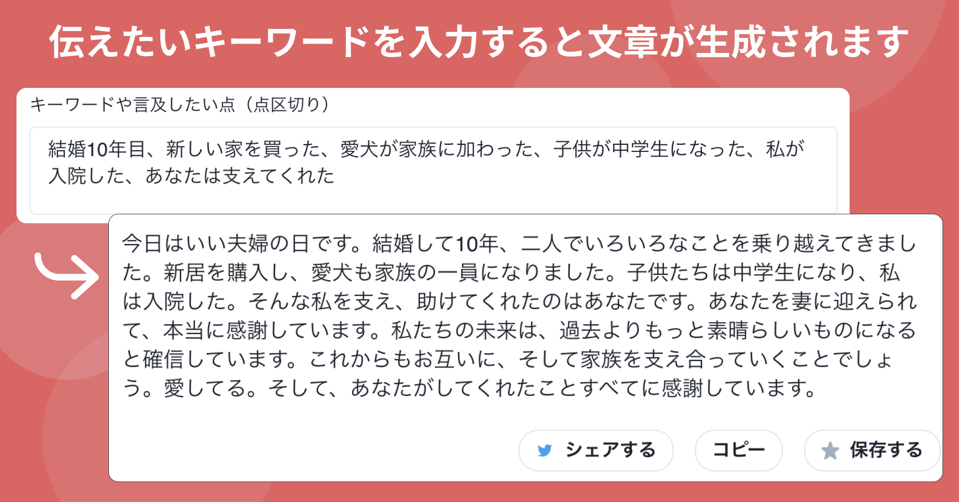 実際に、弊社の既婚メンバーが「感謝を伝える」文章作成ツールを利用して文章を作成し、妻や夫へ感謝の気持ちを伝えました。
