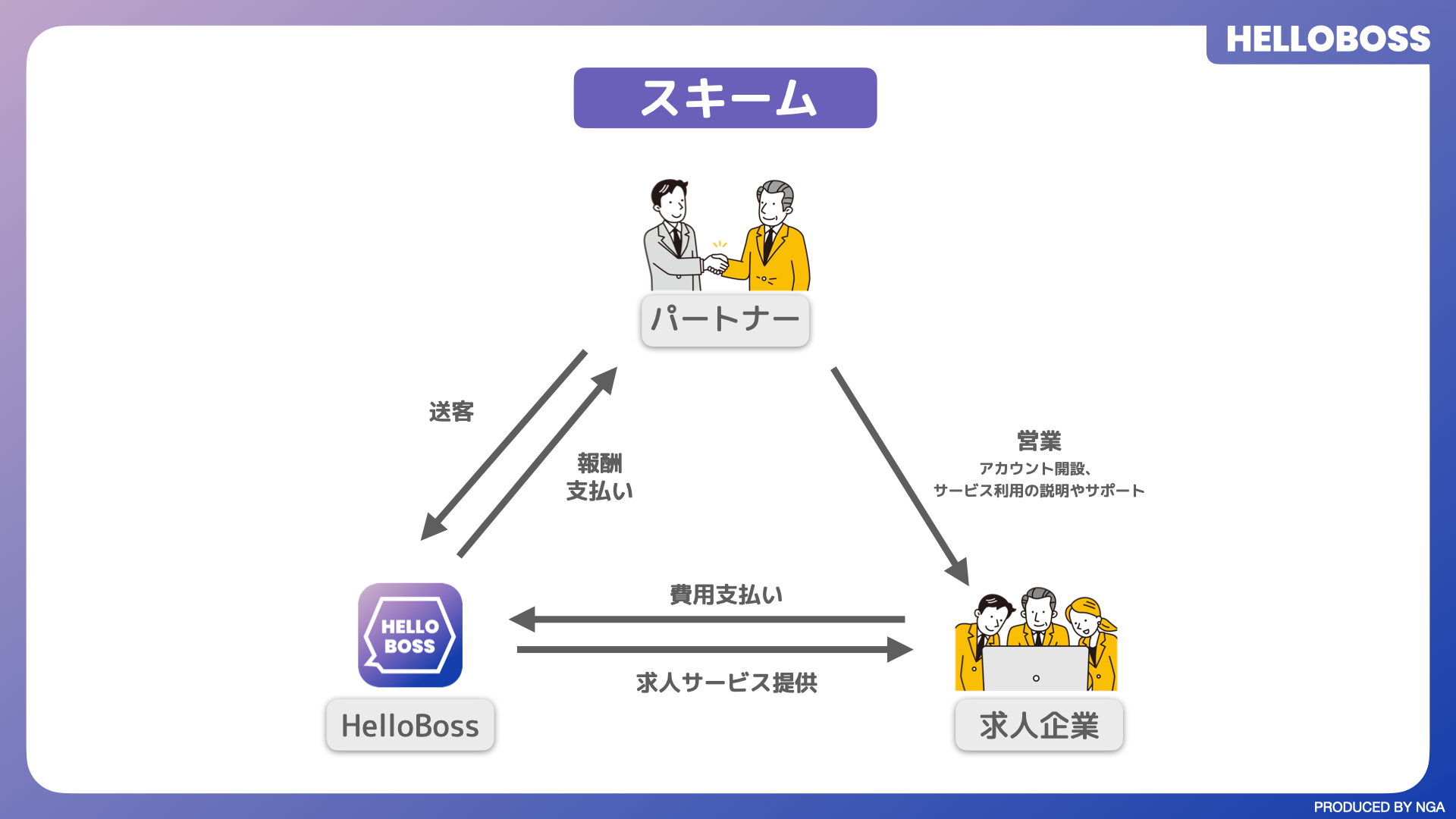 「ビジネスパートナー」は、NGAが業務上採用を含めた法人への支援に携わる企業向けに設けた『HelloBoss』サービス上の制度です。ビジネスパートナーになった企業は、採用側として『HelloBoss』を利用する企業の開拓を担い、アカウント開設案内や利用にあたってのサポートを提供します。ビジネスパートナー経由で『HelloBoss』を利用する企業は、一般企業と同様に『HelloBoss』の求人サービスを使うことになります。