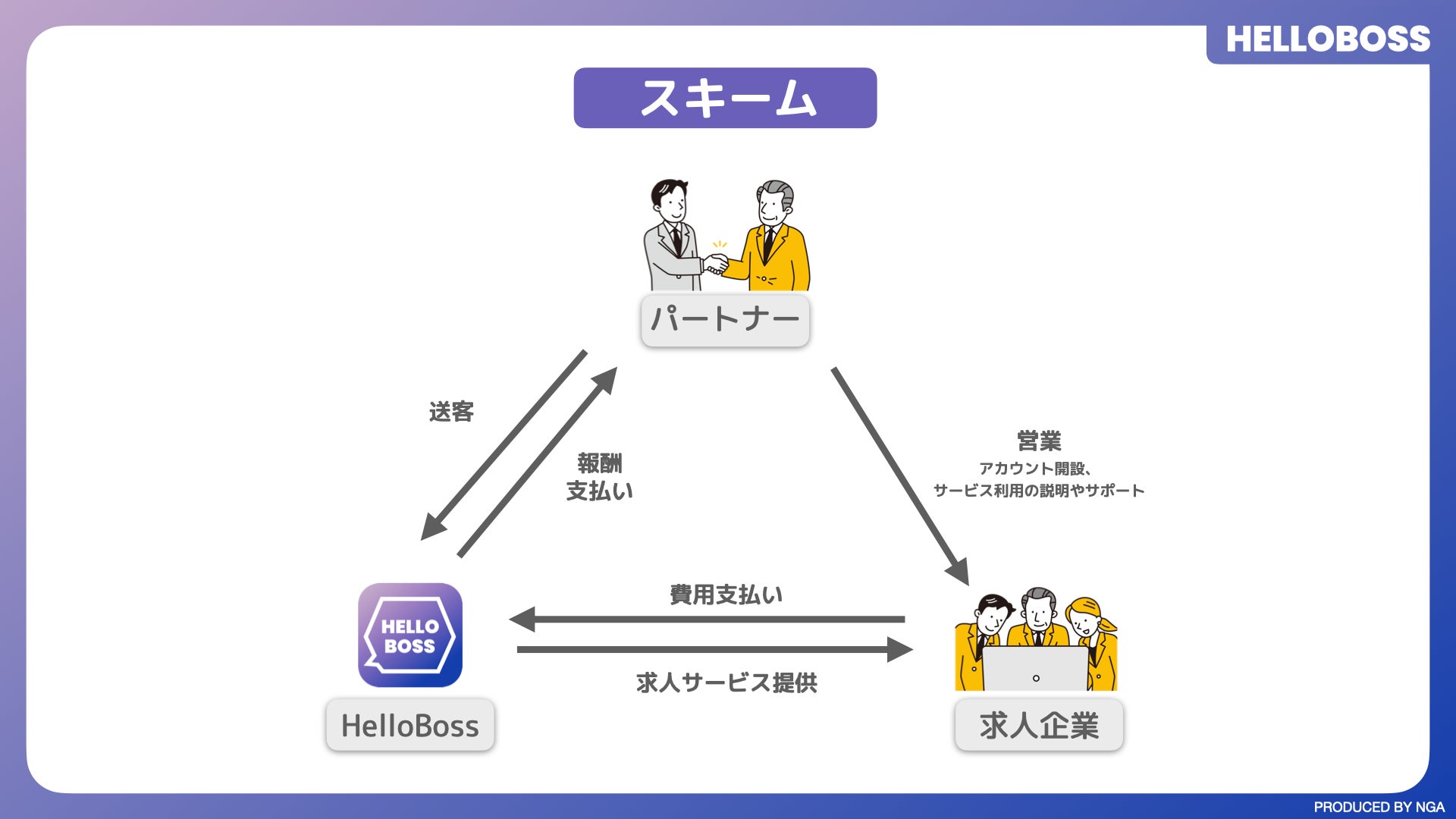 NGAは、ビジネスパートナー制度を通して、『HelloBoss』・パートナー側・求人側の「三方よし」の実現に取り組むことで、引き続き中小企業を含めたより多くの企業の採用課題の解決に励み、社会全体の人材流動の促進を図っていきます。