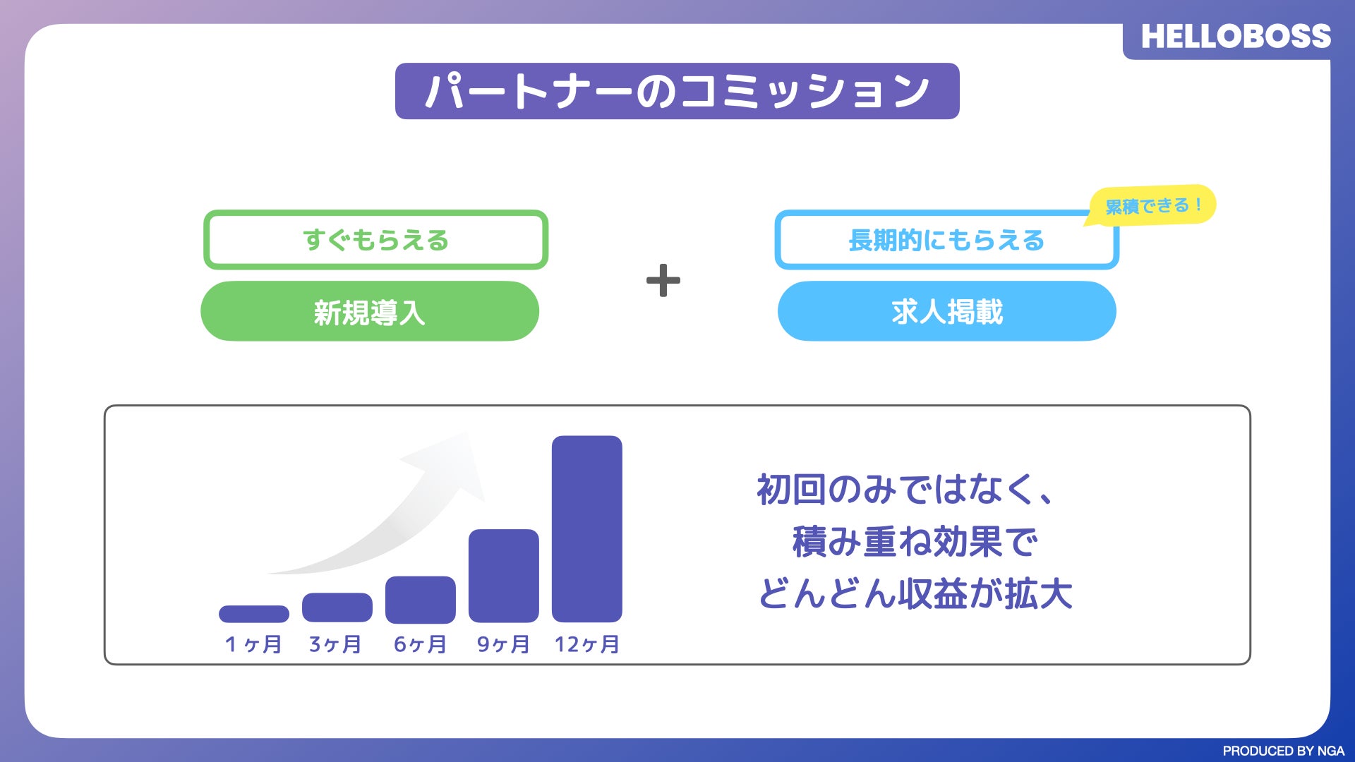 利用の流れとしては、企業がNGAに申請し、ビジネスパートナーとして活動する契約を結びます。契約済みのビジネスパートナーには専用のコードが発行され、そこから活動が開始できます。NGAからビジネスパートナーには、新規導入件数ごとの固定報酬と、毎月紹介企業が『HelloBoss』に支払った掲載料金に応じた一定割合のコミッションを支払います。新規導入の報酬だけでなく、掲載期間中にもコミッションが発生するのは、『HelloBoss』のビジネスパートナー制度の特徴の一つです。