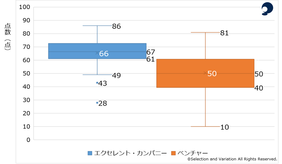 ・エクセレントカンパニーのボード・スキルマトリクスの平均点は66点(中央値67点) 、ベンチャー企業は50点(中央値50点)であった。