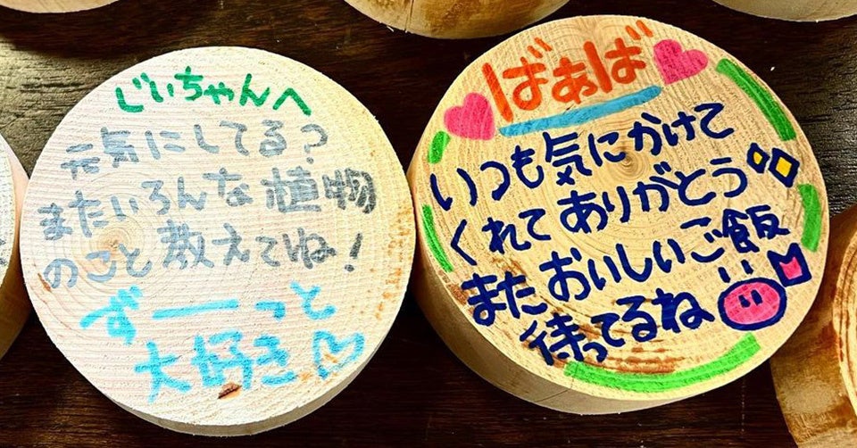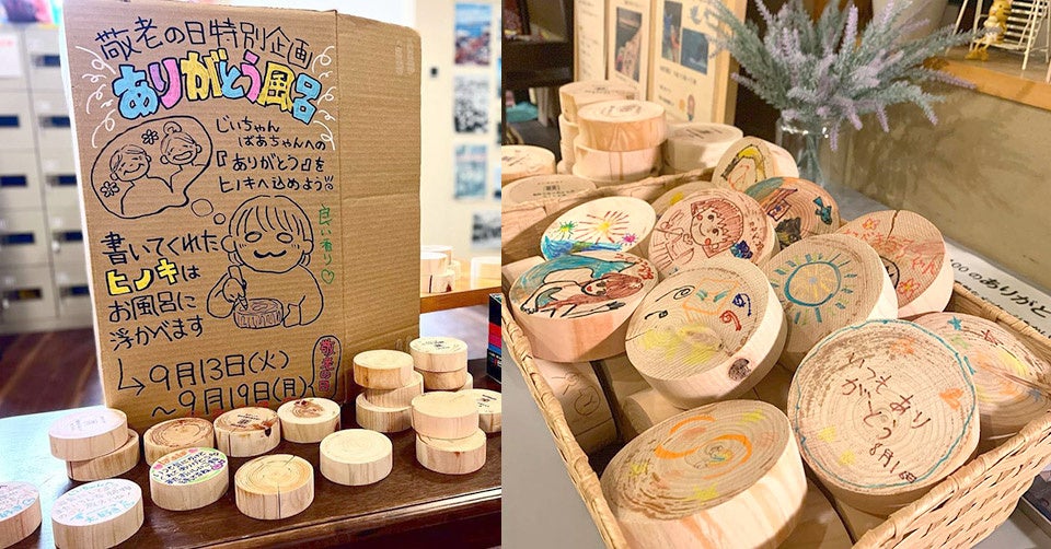 メッセージが記されたヒノキの輪切りを浴槽に浮かべ、高齢の方々への感謝を湯船で共有
