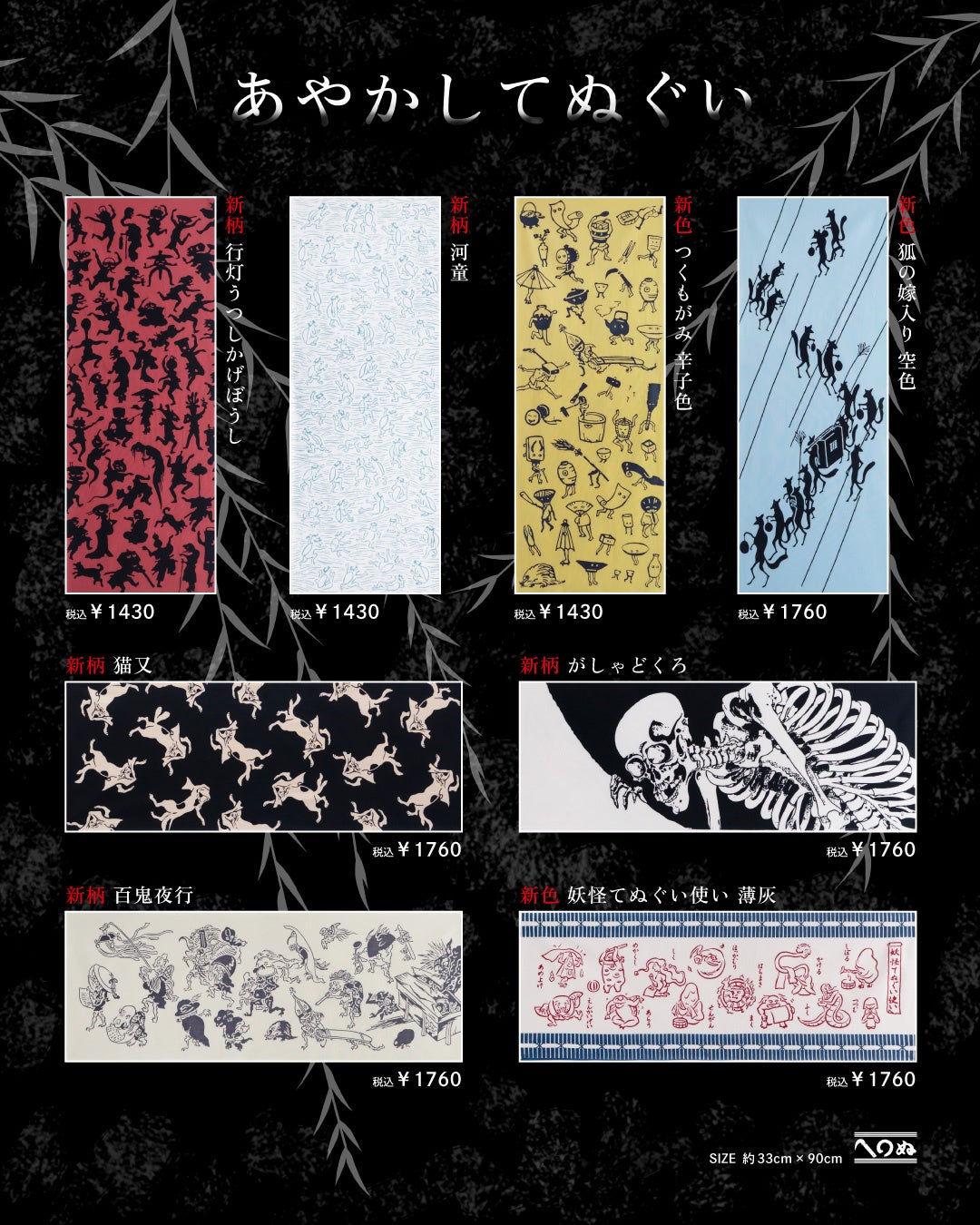 江戸の浮世絵に描かれた妖怪から、猫又や河童などの人気キャラクターまで、ユーモラスでちょっぴりおどろおどろしい手ぬぐいが登場!店舗限定の「つくもがみ」モチーフの刺繡サービスも!