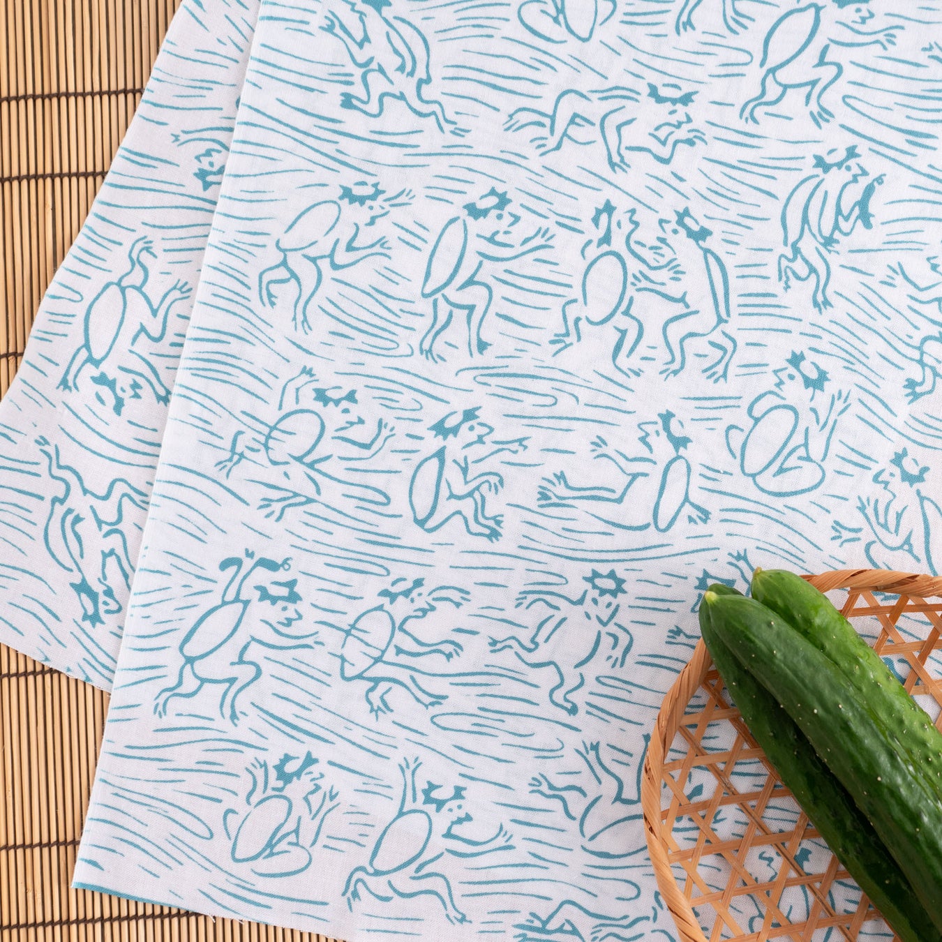 川で遊ぶ河童のさまざまな表情が涼やかで楽しいてぬぐいです。日本古来の未確認生物である河童は、各地に伝承が伝わる人々にとって身近な存在です。夫婦や家族円満に加え子宝の象徴とされ、お酒や水の神様としてもまつられています。