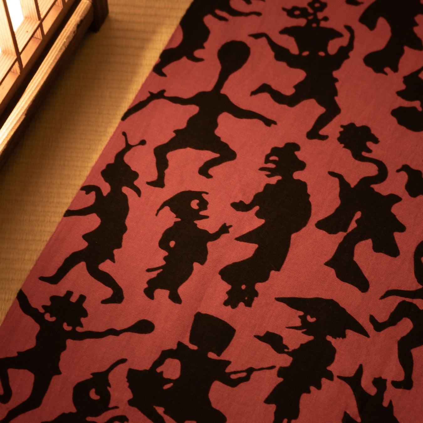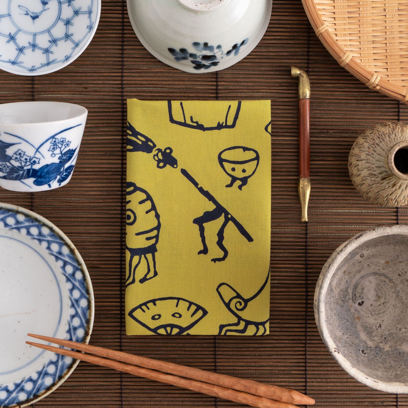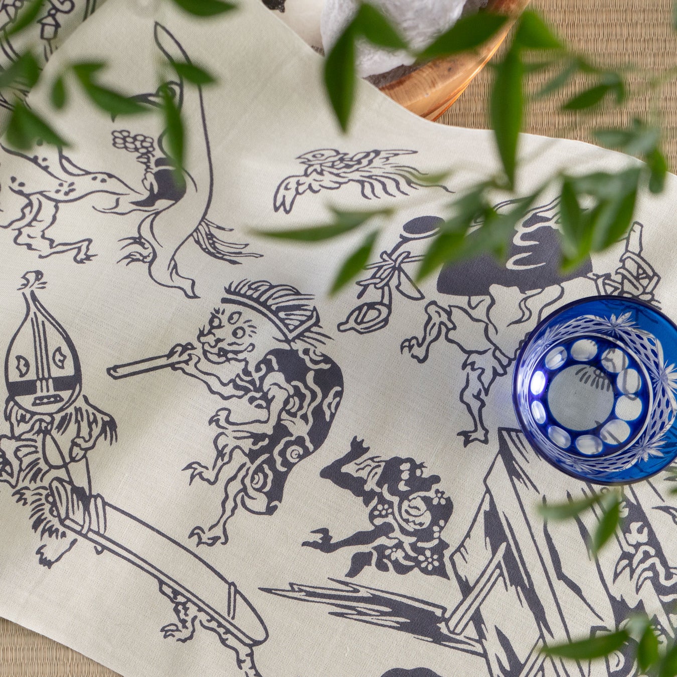 日本では、百年使われた道具には魂が宿るとされ、九十九年で捨てられたものは“つくもがみ”となって化けるという言い伝えがあります。どこか愛嬌のあるその姿には、人と道具との長い時間がにじんでいるよう。そんなつくもがみたちを小紋柄で表現。