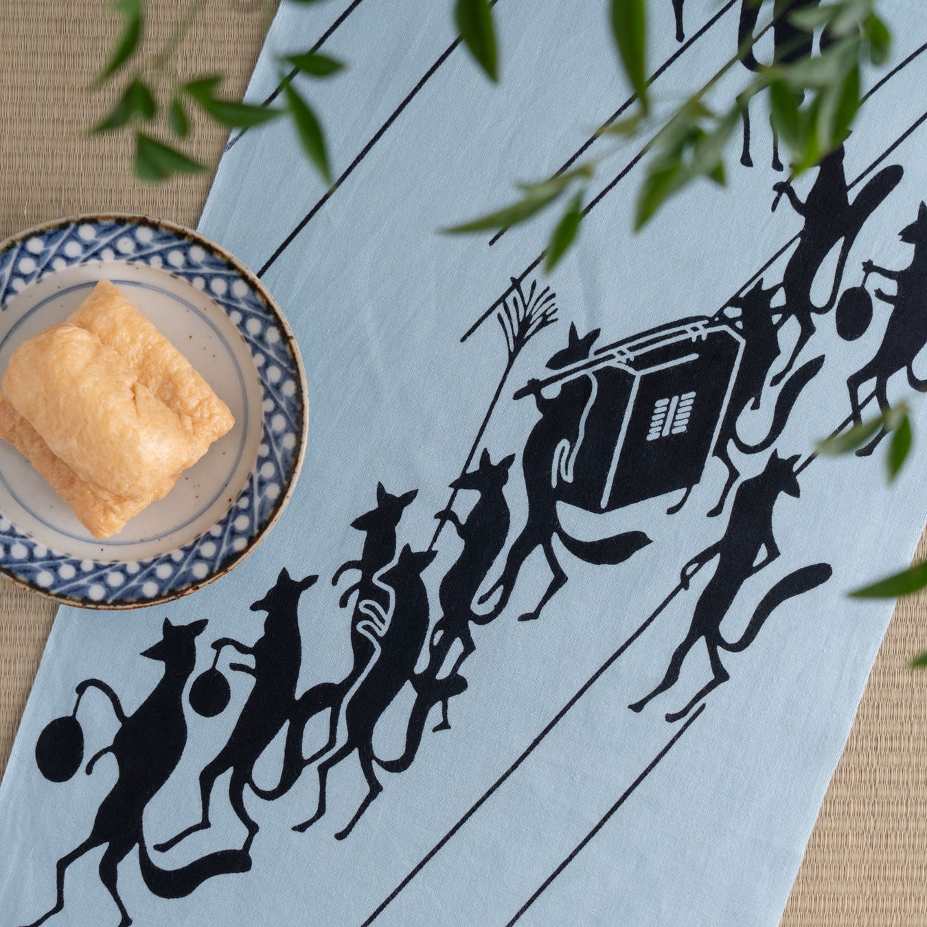 狐の嫁入り行列の神秘的な伝承の風景を涼やかに表現したてぬぐいです。