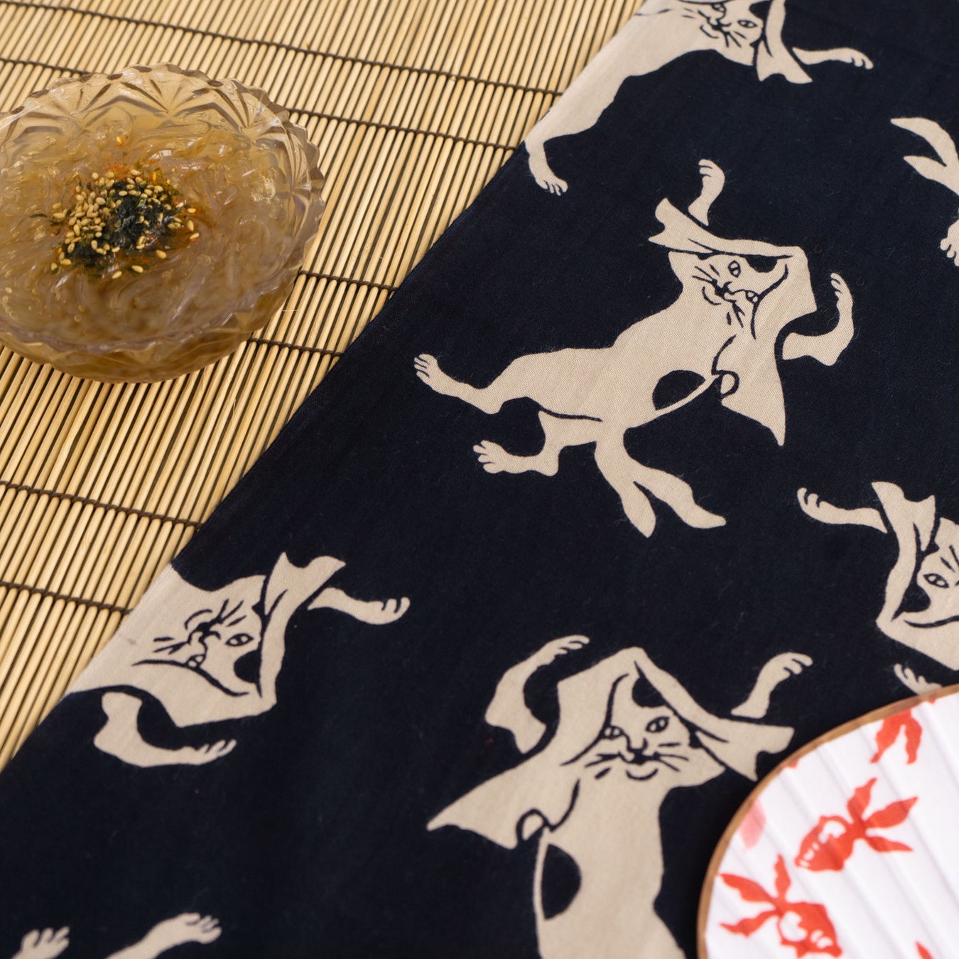 暗闇に浮かび上がる猫又の姿を不気味に描いたてぬぐいです。人家で飼われているネコが年老いて猫又に化け、てぬぐいをくすねて踊るという伝説は、浮世絵などさまざまな日本美術に登場するモチーフです。中には、猫が驚いたり威嚇したりする時に出る、たぬきしっぽになっている猫又も。