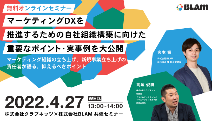 株式会社クラブネッツ(本社:東京都渋谷区、代表取締役社長:冨安 仁)は、2022年4月27日(水)13:00より、デジタルシフトを検討している企業を対象としたオンラインセミナー『マーケティングDXを推進するための自社組織構築に向けた重要なポイント・実事例を大公開』を開催します。