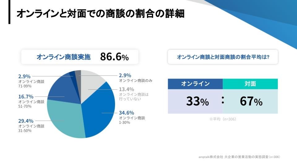 オンライン商談を実施する割合は、従業員1,000人以上の大企業においても86.6%となっています。このように、出社の割合が増えながらも各企業はオンラインによる商談を引き続き行っており、オンラインに適応した営業戦略・営業手法の策定やデータ分析に取り組むことが求められています。