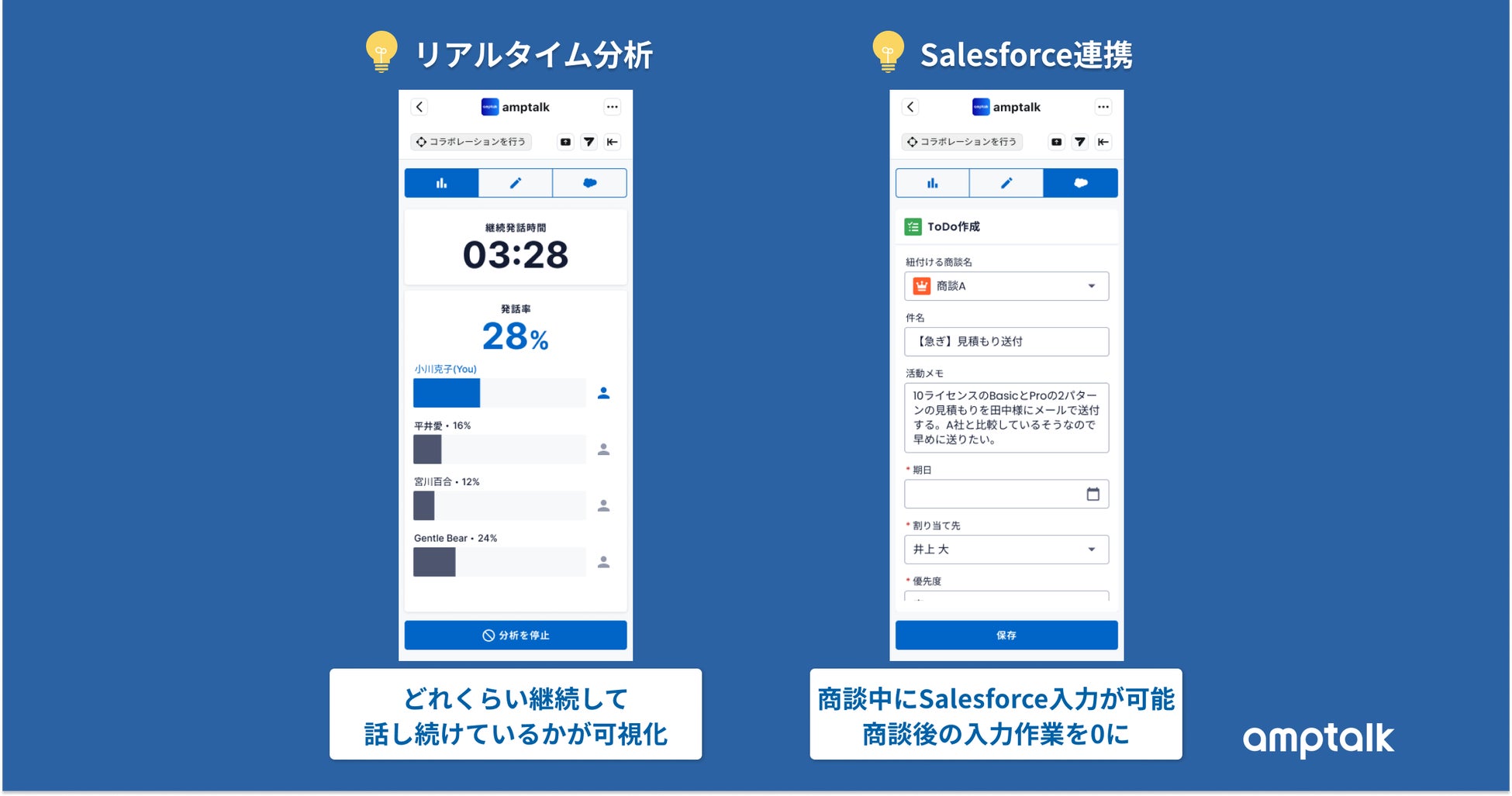これらの課題に対し、アンプトークは商談を分析し、可視化することでフィードバックの効率化や迅速かつ抜け漏れのない情報共有を実現することで、ユーザー企業の営業活動の生産性向上に取り組んでいます。