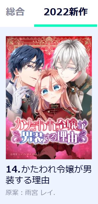 ランキングには上位20作品が掲載されており、『かたわれ令嬢が男装する理由』は第14位にランクインしています。