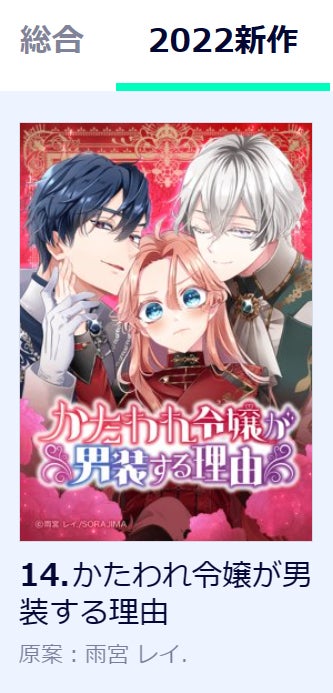 SORAJIMAの人気作品『かたわれ令嬢が男装する理由』が、「LINEマンガ2022年間ランキング」の「2022新作」部門において、第14位にランクインしました。掲載されている上位15位内の作品の中で、日本の制作スタジオはSORAJIMAのみとなります。