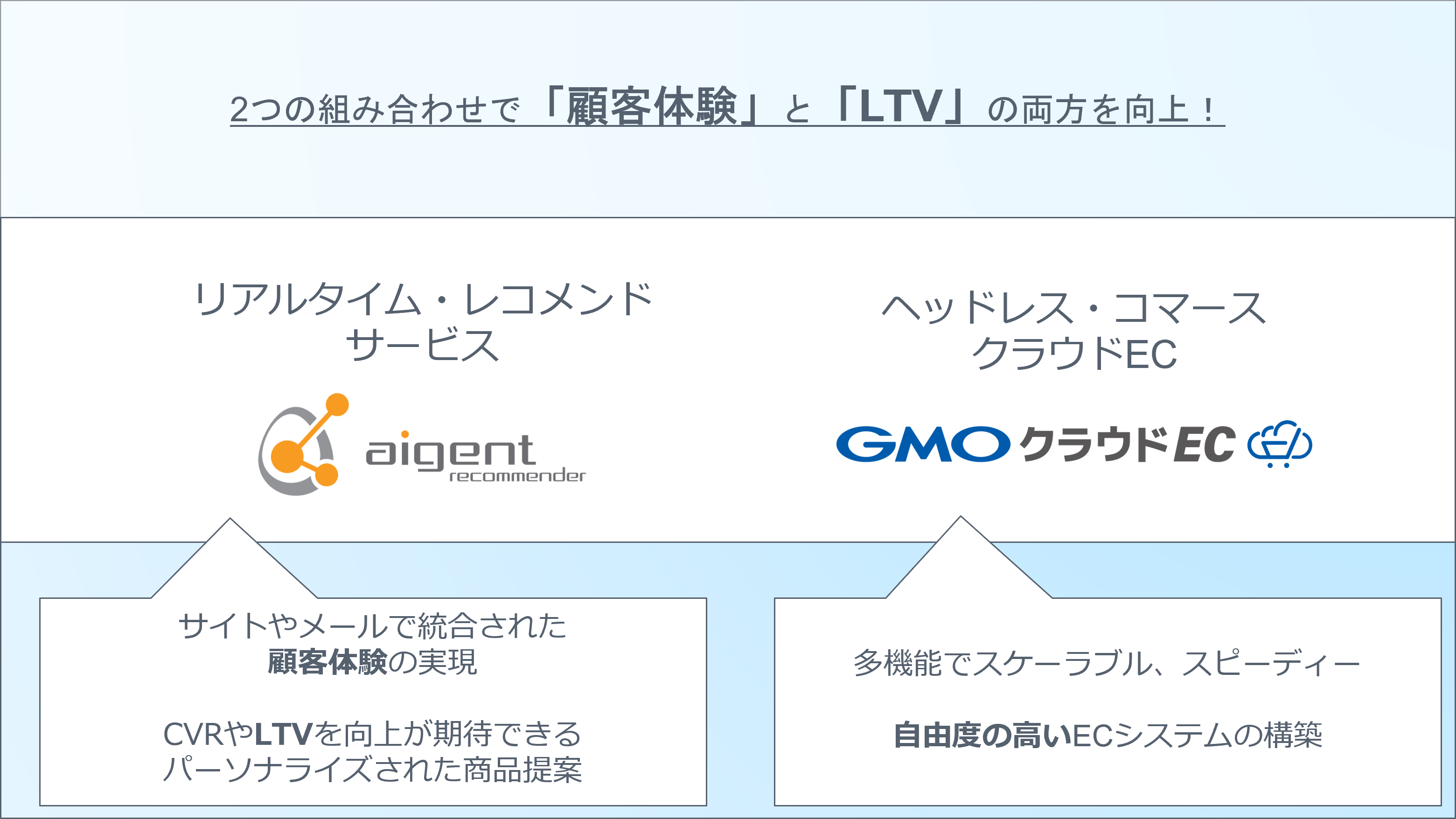 ヘッドレス・コマースを採用した「GMOクラウドEC クラウドECプラン」は拡張性が高く、会員数の増加に対応した様々な接客機能の導入や、ブランド力を高める独自のサイトデザインが容易に実現できます。このプラットフォーム上で、「アイジェント・レコメンダー」による「一人ひとりのニーズに合わせた商品やコンテンツの提案」が可能となることで、さらなる顧客体験とLTVの向上が見込め、EC事業者様にとっては、信頼できるブランドとしての成長が期待できます。