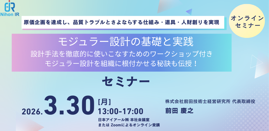 アイアール技術者教育研究所は、機能の異なる部品(モジュール)を組み合わせて低コストで機能バリエーションを実現する「モジュラー設計」を、講演+ワークショップで体系的に習得できる公開セミナーを開催します。
