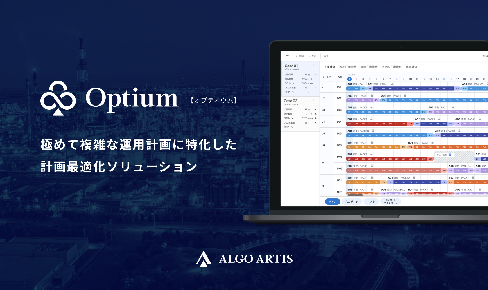 ALGO ARTISは、「社会基盤の最適化」というコーポレートミッションのもと、生産や配船といった極めて複雑な運用計画に特化した計画最適化ソリューション『Optium(オプティウム)』を開発・提供しております。