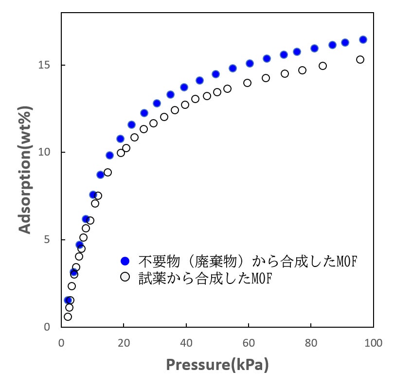 鋳造工程から発生する不要物(廃棄物)を原料として、多様なガスを選択的に吸脱着するMOFであり、市販試薬から合成されたMOFと同等以上の吸脱着性能を有しています(図2)。