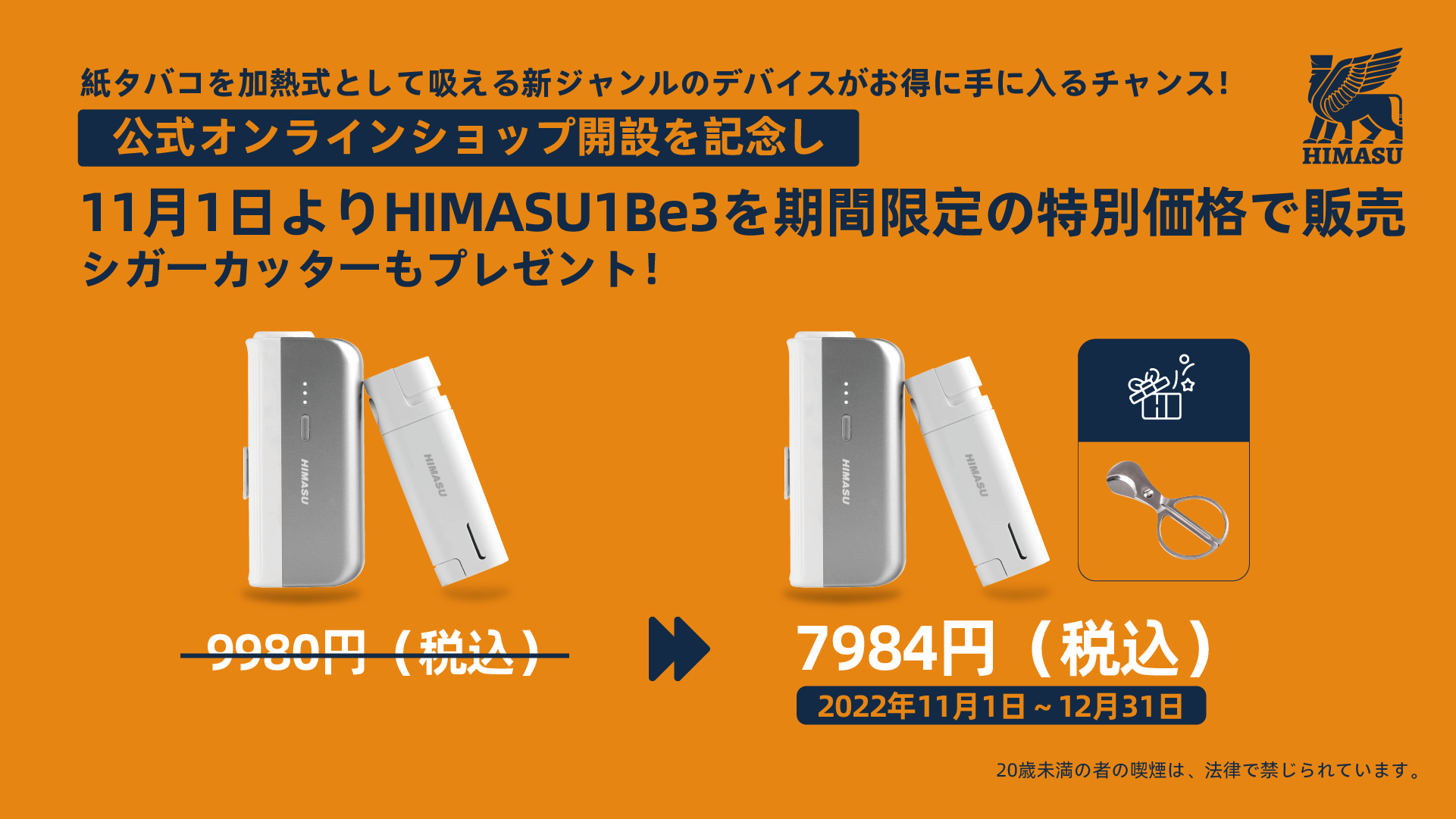 紙タバコを加熱式として吸える新ジャンルのデバイスがお得に手に入るチャンス! 公式オンラインショップ開設を記念し11月1日よりHIMASU1Be3を期間限定の特別価格で販売