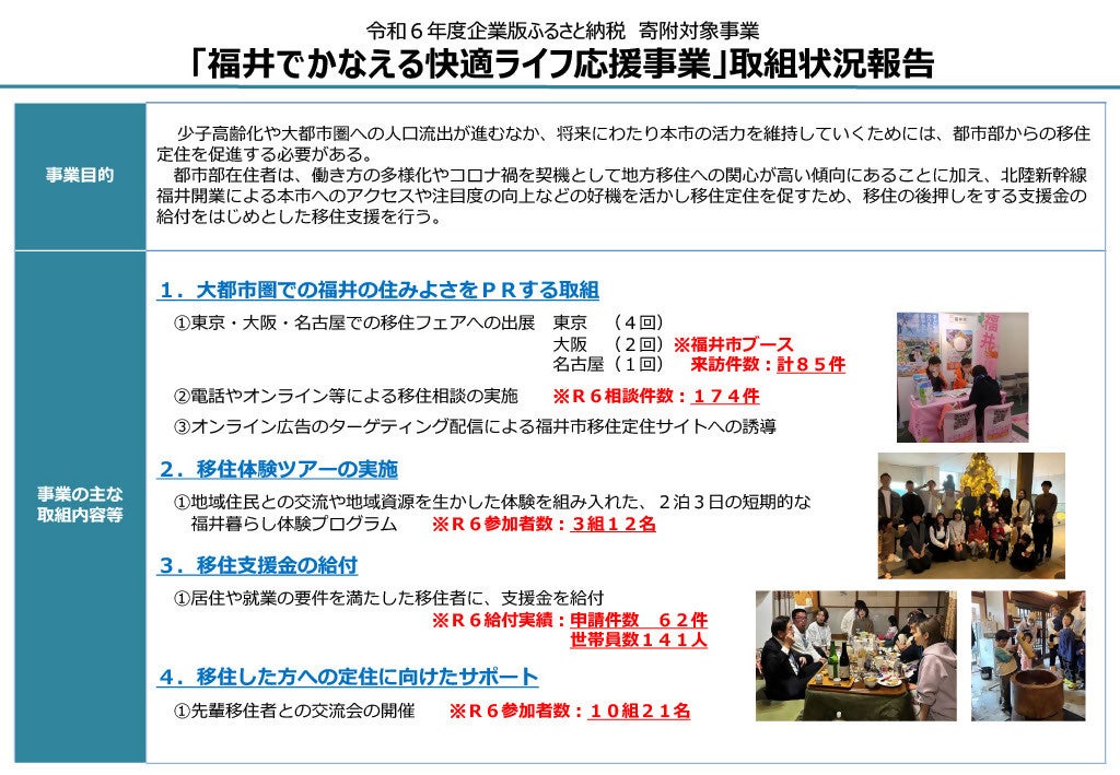 いただいた寄付は、福井市の地方創生に関する事業に活用され、令和6年度は「福井でかなえる快適ライフ応援事業」として、移住フェアへの出展、移住体験ツアーの実施、移住支援金の給付、先輩移住者との交流会など移住定住施策に充てられました。