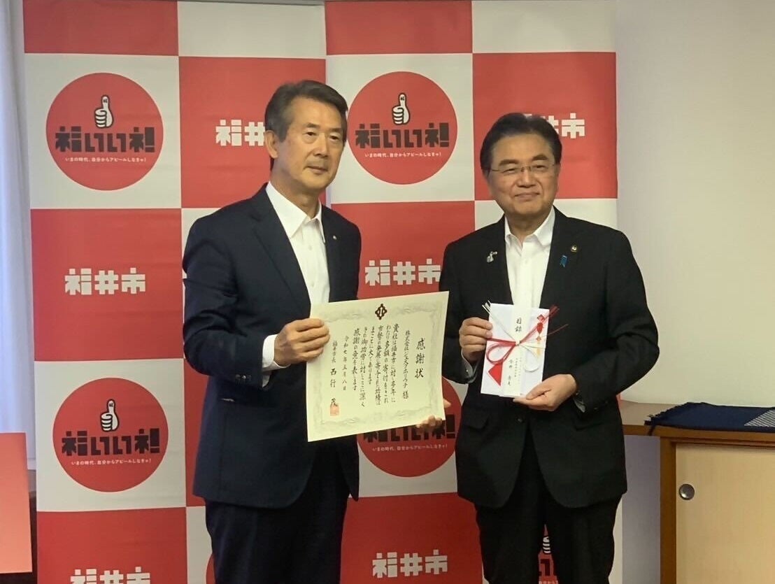 令和7年5月8日(木)、福井市役所を訪れた今井社長から西行茂福井市長が目録を受け取り、西行市長から今井社長に対して感謝状を贈呈しました。