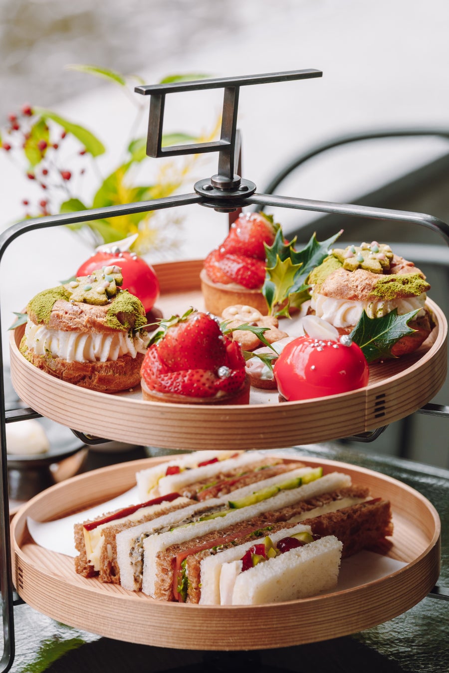 フェスティブシーズンを象徴する苺や旬の素材をふんだんに使用したペストリーとセイボリーが、テーブルに華やかな彩りを添えます。スコーンは、スパイスの香りがほのかに広がるバターミルクとミックスフルーツを練り込み、クロテッドクリームと季節のジャムが味わいを一層引き立てます。セイボリーには、チキンに小豆島オリーブとクランベリーを合わせた香り豊かな一品や、黒トリュフの芳香が広がるエッグマヨネーズ、スモークサーモンをケールペストで爽やかに仕上げたもの、さらにスイートポテトとスモークチーズの軽やかな温もりが感じられる組み合わせなど、多様な味わいが並びます。