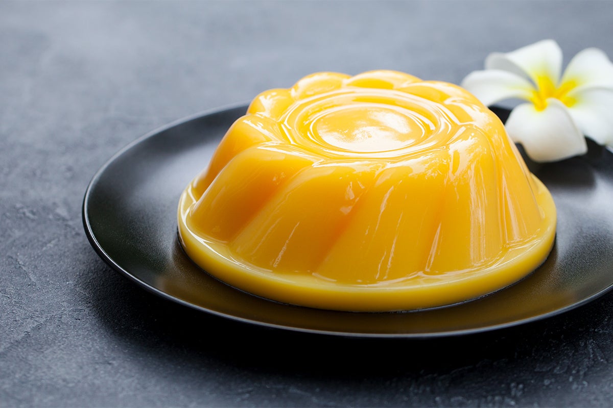 (1) 耐熱ボウルに卵1個、低脂肪牛乳300ml、粉ゼラチン5gを加えてよく混ぜる