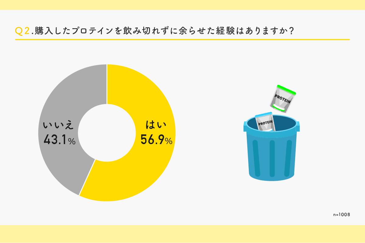 さらに購入したプロテインを飲みきれず余らせた経験を聞いたところ、56.9%の人が「はい」と回答。半数以上の人が何らかの理由でプロテインを余らせているという結果となりました。