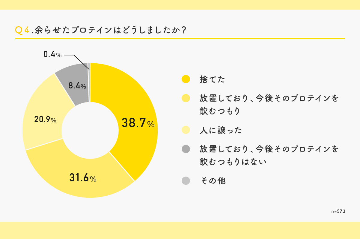 一方で、「人に譲った」「放置しているが、そのプロテインを今後飲むつもり」など購入したプロテインを無駄にしないようにしている人が半数以上いることがわかりました。