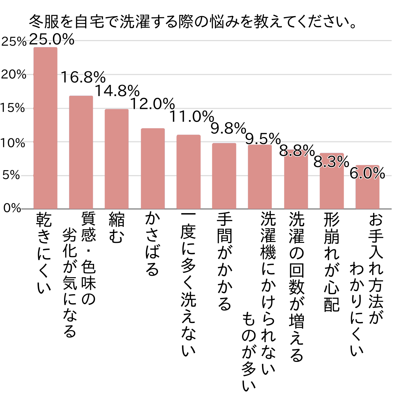 また、冬服の素材は「洗濯機にかけられないものが多い(9.5%)」ので「手洗いが大変(4.3%・グラフ外)」で、洗うこと自体できないものも多いと言えます。節約のために自宅で洗った場合には、風合い等「質感・色味の劣化が気になる(16.8%)」、「(ニット等が)縮む(14.8%)」、「しわになりやすい(4.5%・グラフ外)」、「毛玉ができる(3.0%・グラフ外)」等、何かと悩みが多くお手入れに気を遣う実情が見えてきました。