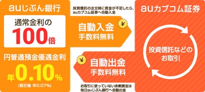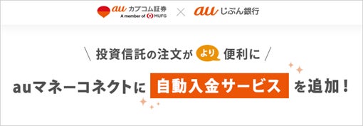 auカブコム証券株式会社(本社:東京都千代田区、代表取締役会長兼社長:二宮 明雄、以下「auカブコム証券」)とauじぶん銀行株式会社(本社:東京都中央区、代表取締役社長:石月 貴史、以下「auじぶん銀行」)は2022年11月19日より、両社が提供する「auマネーコネクト」に、投資信託の購入時(積立取引は除く)にauじぶん銀行の円普通預金口座からauカブコム証券口座に自動で不足金額が入金される「自動入金サービス」を新たに追加いたします。