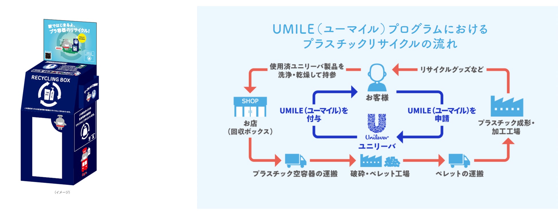 今回両社が連携する「UMILE(ユーマイル)プログラム」は、毎日の暮らしの中でお得にエコ活ができるプログラムとして、2020年11月よりユニリーバ・ジャパンが開始したものです。ご家庭で使用後に洗浄・乾燥したユニリーバ製品の空のプラスチック容器を回収ボックスに入れ「リサイクルしてためる」、またはユニリーバのつめかえ製品を「買ってためる」の2つの方法で、「UMILE」というポイントをためられます。UMILEは、LINEポイントに交換したり、子どもたちのために活動している団体に寄付できます(1UMILE=20LINEポイントまたは20円の寄付)。回収した空容器は、再生工場にて処理・加工し、エコグッズなどにリサイクルされます。同時に、プラスチック容器を再び容器へと戻す「ボトル to ボトル」(水平リサイクル)に向けた検討も進めています。