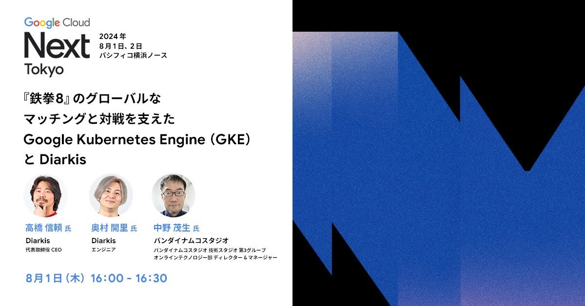 ブレイクアウトセッションには、株式会社バンダイナムコスタジオの中野氏をゲストにお招きし、『鉄拳8』を通じて Google Kubernetes Engine(GKE)と Diarkis の新たな展望や技術的な深層に迫ります。ぜひ視聴してください!