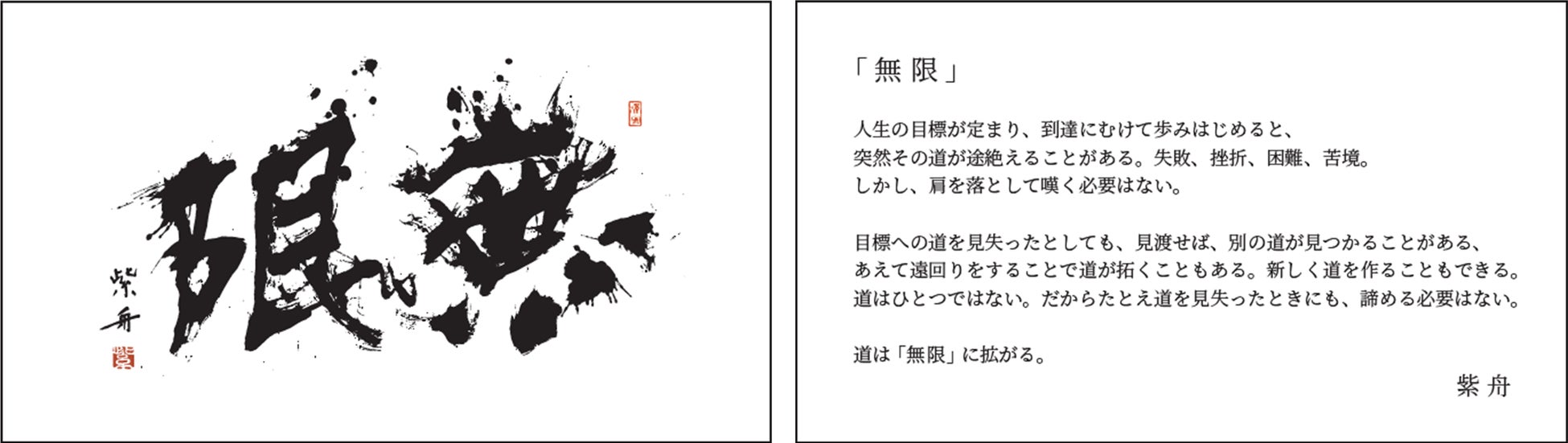今回の日本酒には、正面デザインに「You’re unlimited」と入っており、「無限大の可能性を秘めている」というメッセージも込められています。そのため、今回酒を入れる木箱には、NHK大河ドラマ「龍馬伝」の題字を手掛け、天皇皇后両陛下(現上皇上皇后両陛下)が作品展に行幸啓されるほどの実力を持つ、書家「紫舟」の作品『無限』をダイナミックに施しました。