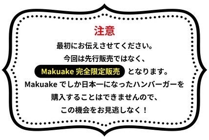 | ② MAKUAKE割 | 限定80名様日本一バーガー1種+応援隊員証=¥5,500 バーガー2種+応援隊員証=¥9,000 |