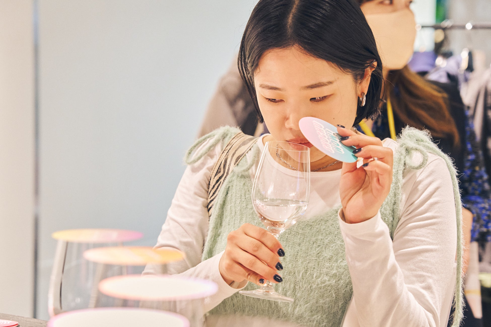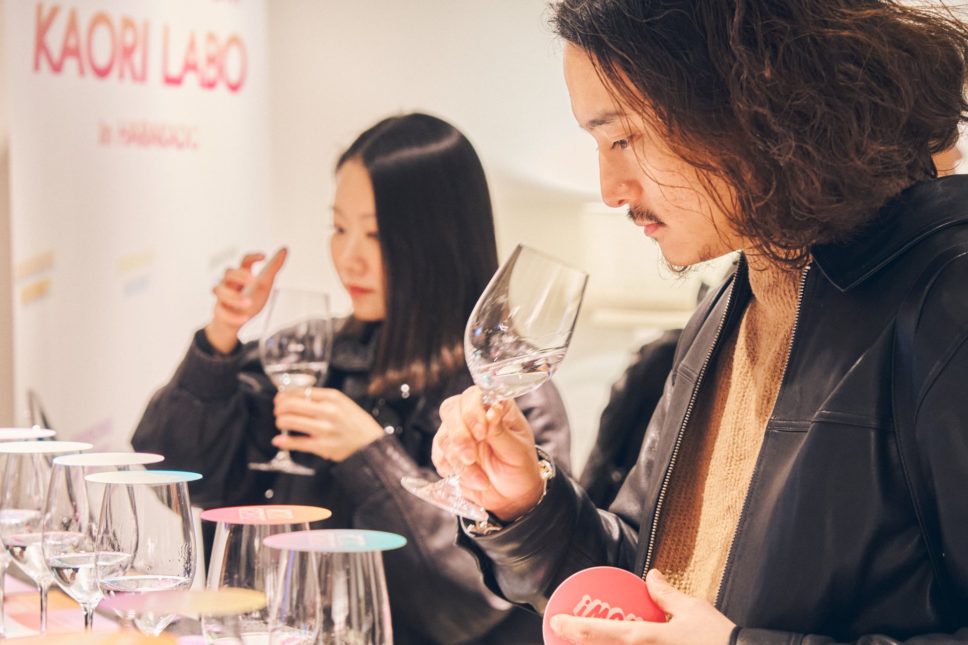 1つ目のブース「SHOCHU AWAMORI KAORI LABO」では、まず10種類のワイングラスに入った本格焼酎・泡盛を用意。「香りだけ」を嗅いで、本格焼酎・泡盛の多様性を体感しつつ、それぞれ自分好みの香りを選んでいただきました。
