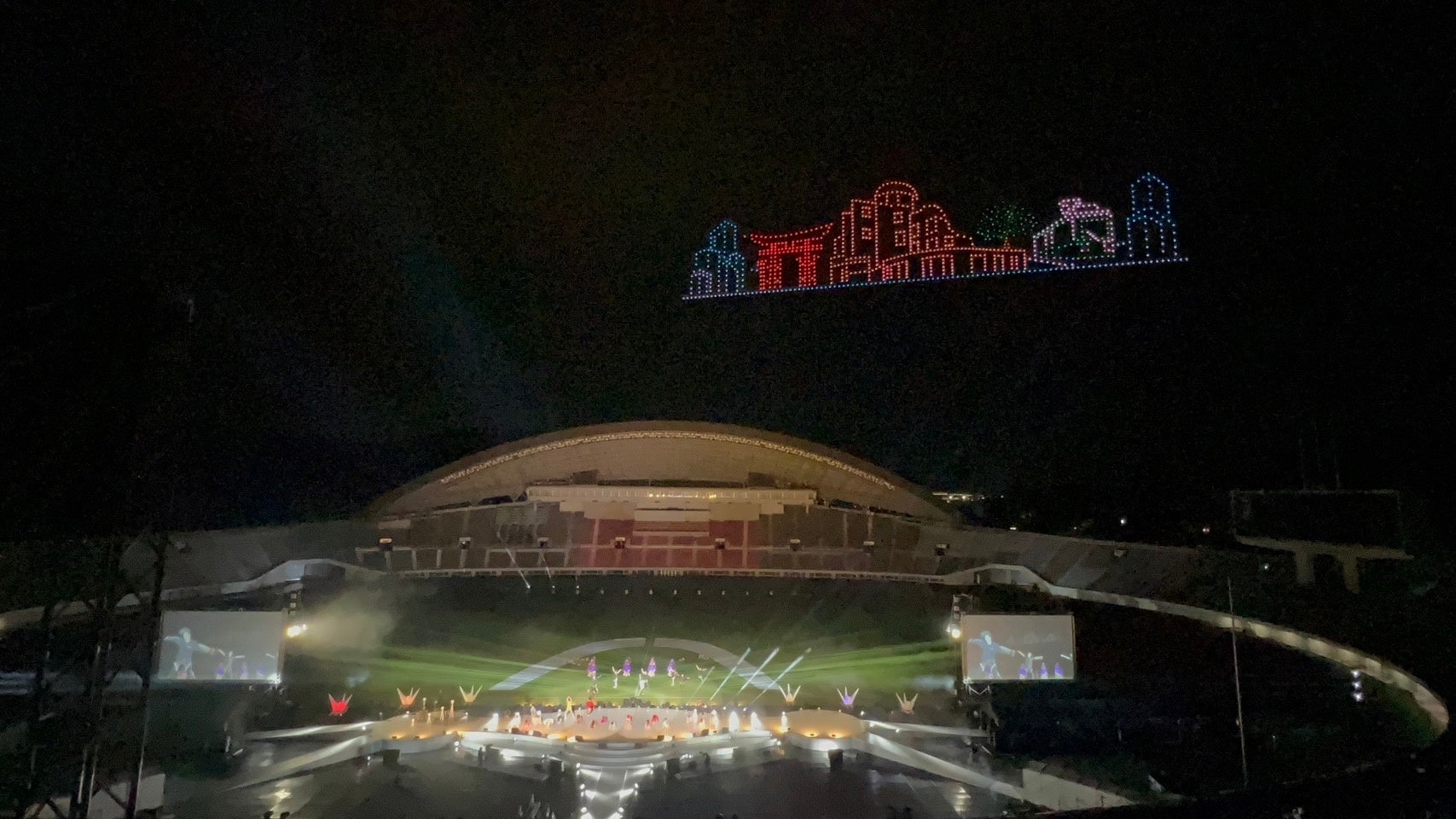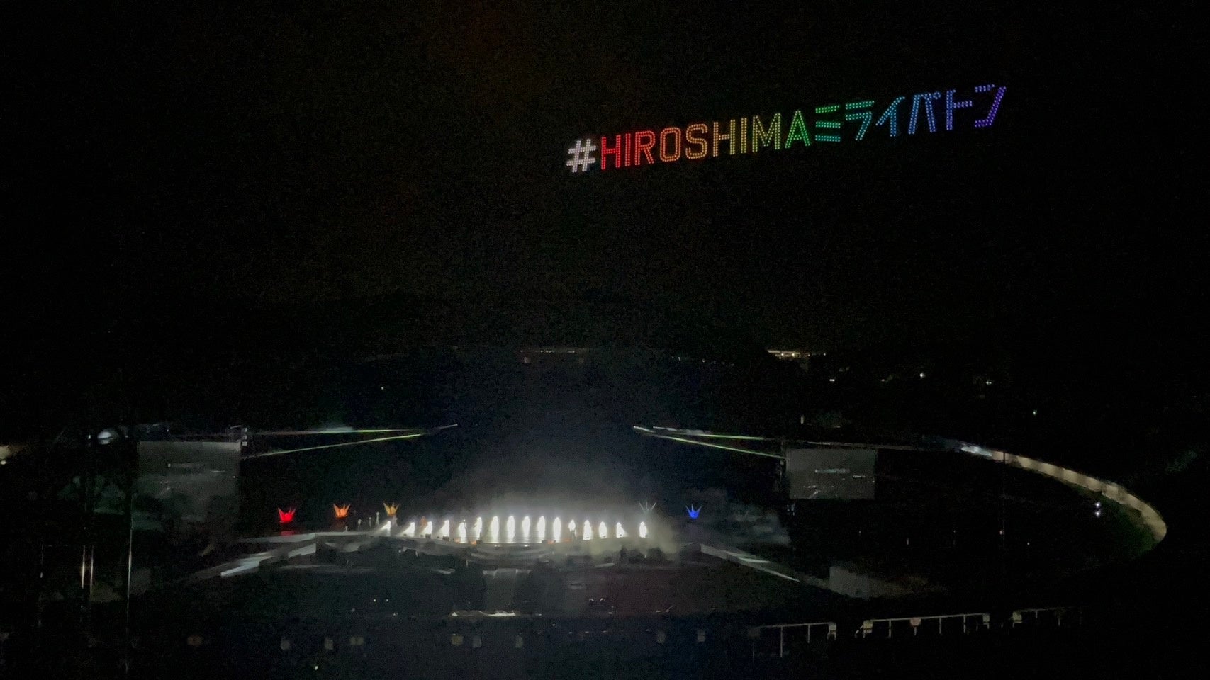 エディオンスタジアムのステージにて、人気グループ「EXILE TRIBE」や「STU48」のメンバーらが歌とダンスなどのパフォーマンスで観客を盛り上げ、被爆ピアノでの弾き語りが披露されました。ドローンショーでは夜空をキャンバスに、広島の街並みや原爆ドーム、日本から世界各地へ発信する地球などを表現し、クライマックスには1000機のドローンで折り紙を折る演出、虹色に輝く巨大な折り鶴が羽ばたく様子を表現して平和の尊さを日本から世界へ発信しました。