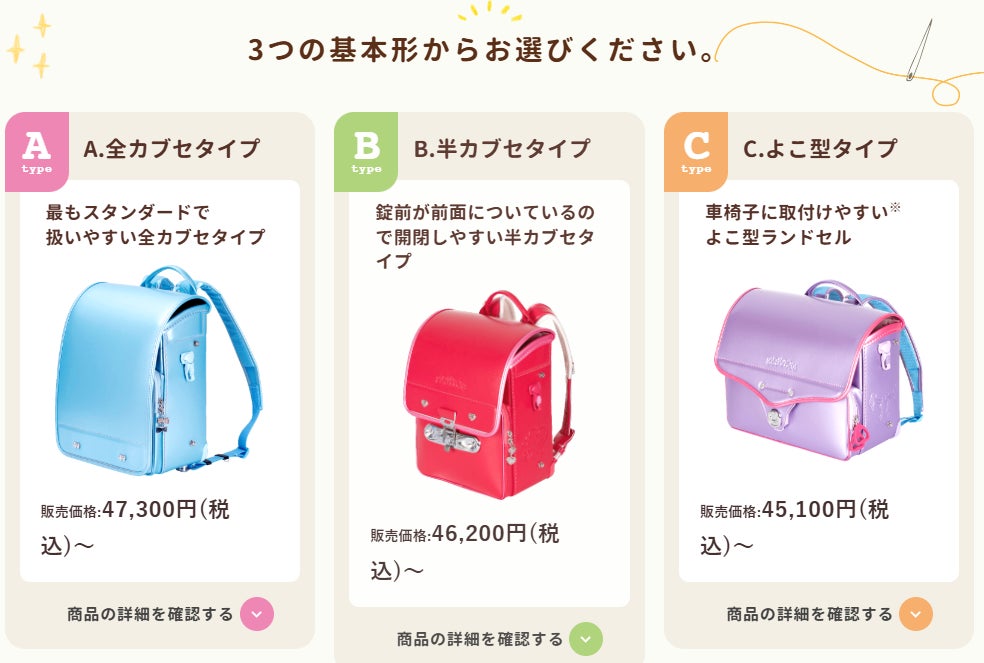 開発当初は一般社団法人全国肢体不自由児者父母の会連合会のご協力と推奨をいただき、3タイプの基本の形を完成させました。基本の3タイプからお選びいただいた後、お子様の使い勝手に合わせ、オプションなど16項目から選び、それぞれにぴったりのランドセルを完成させます。
