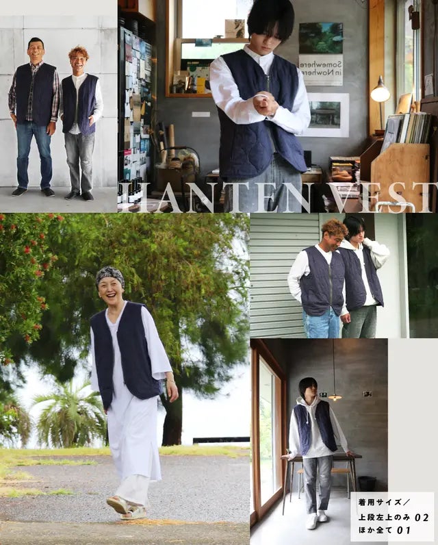 昨年の半纏ジャケットについて、「外に出る時はちょうどいいけど、家の中だと暖かすぎる」とのお客様の声を反映して、袖部分を省いた「半纏ベスト」を考案。利用シーンを選ばず幅広く着回しが利くアイテムをプラスしました。ジャケットとベスト、セットアップして着回しも可能。