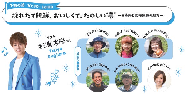 練馬区をはじめ、32自治体の農産物や特産物などが購入できるマルシェのほか、各地の農産物・特産物を使用したメニューを提供するキッチンカーの出店、農業者が講師となるワークショップ、全国の農業者10名とスペシャルゲスト(杉浦太陽さん、宮川大輔さん)を招いたトークライブなど、都市農業の魅力を存分に味わうことができるコンテンツが目白押しです。