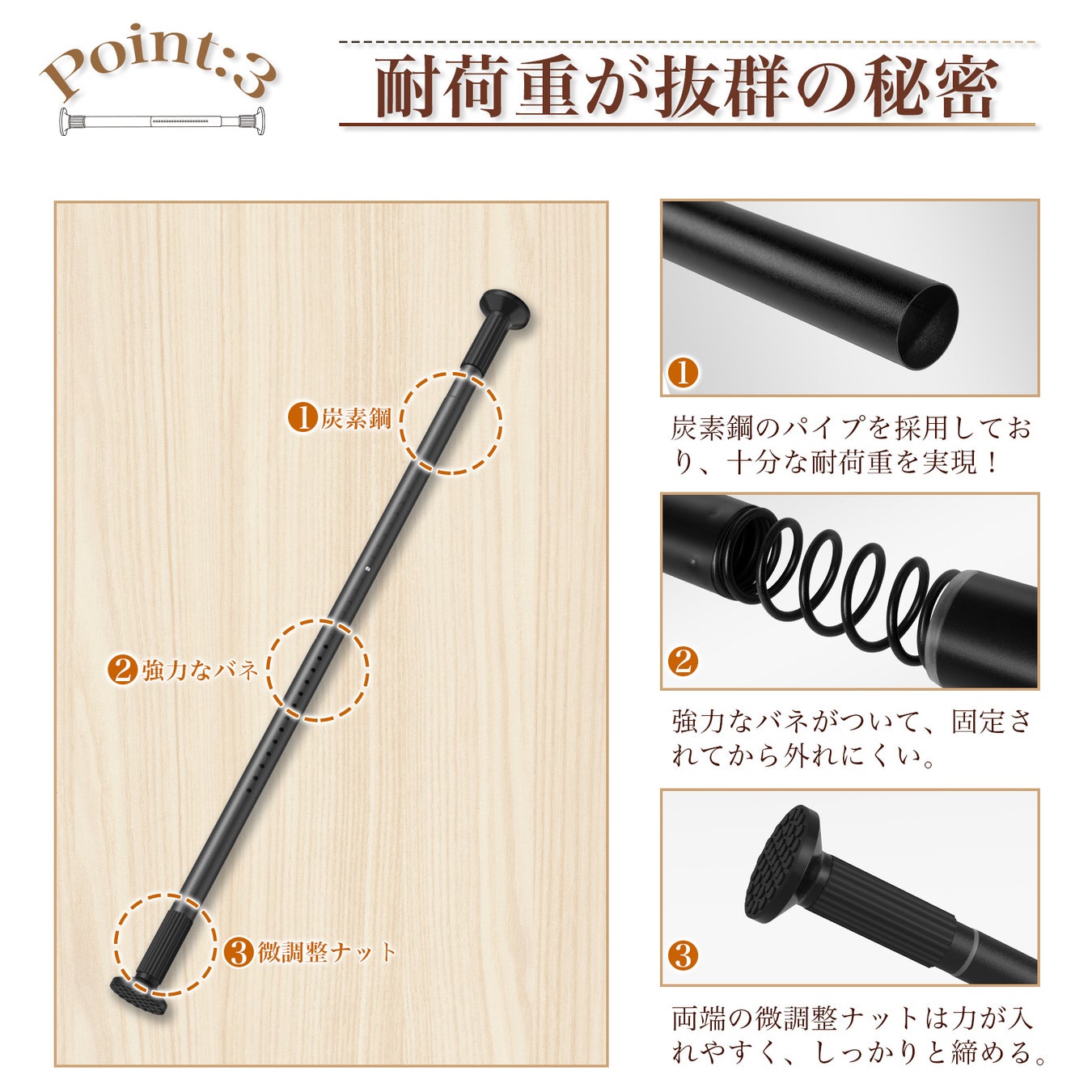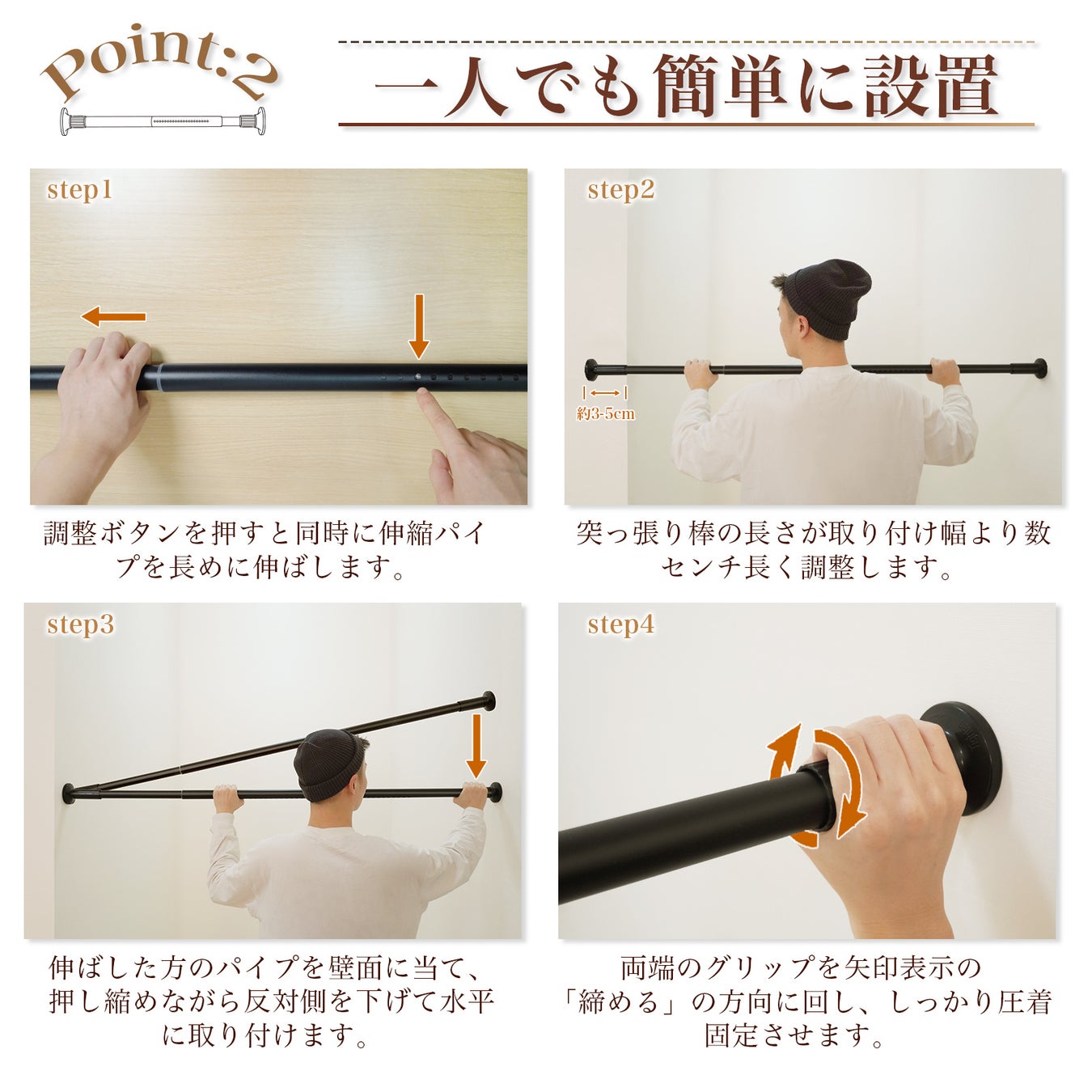 高強度炭素鋼を採用しているつっぱり棒は耐荷重がバッチリ!本体内蔵バネには强力タイプを使用。長く伸ばしてもずれ落ちる心配がない。大量の洗濯物も一度に部屋干し!
