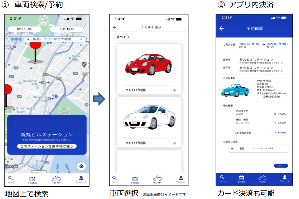 レンタカー事業者が車両情報(料金、保管場所等)をシステムへ事前登録することで、利用者はアプリの地図上から車を検索し、予約可能。