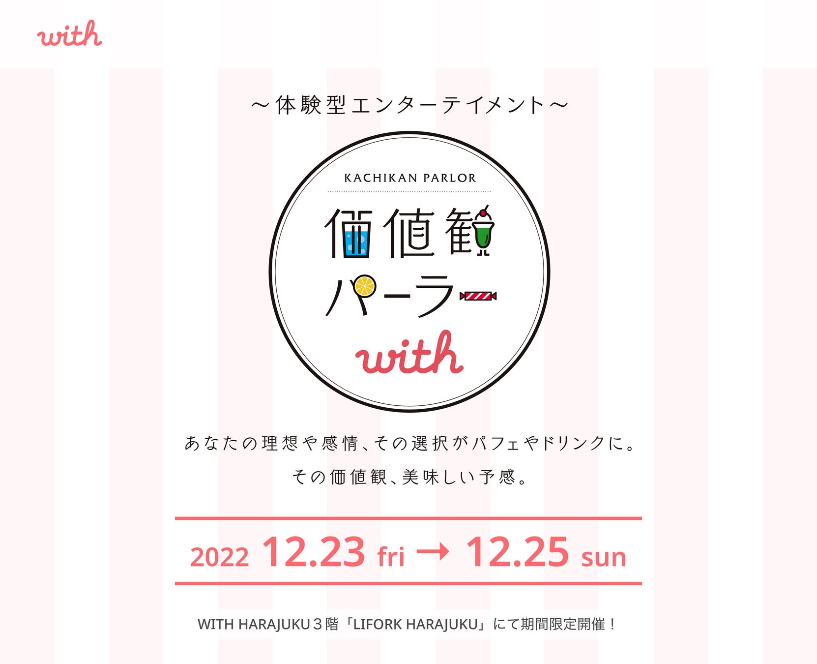 価値観でマッチング可能な恋活・婚活マッチングアプリ『with』を手掛ける株式会社with(東京都渋谷区、代表取締役CEO小野澤 香澄、同CBO五十嵐 昭人)は、体験型エンターテイメント『価値観パーラーwith』を2022年12月23日(金)~25日(日)の3日間限定で、原宿駅から徒歩1分の「WITH HARAJUKU」3階にオープンいたします。