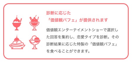 店内で実施される演劇型コンテンツ「価値観エンターテイメントショー」を鑑賞し、「注文したメニューがなかなか届かない場合」、「相手におすすめされたお店が好みと違い、感想を求められた場合」など、デートシーンにおけるさまざまなシチュエーションにおいての理想や感情、その選択が、あなたの価値観を表現した『価値観パフェ』となってお召し上がりいただけます。