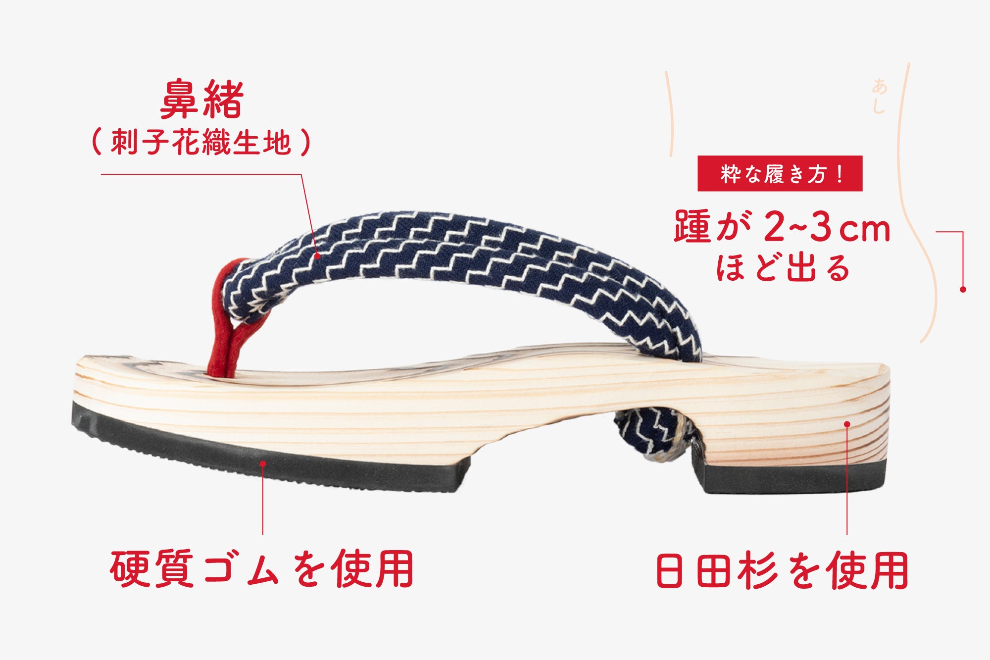 日田杉は軽くて丈夫です。台はゆるやかな曲線で足裏にやさしく馴染みます。底には硬質ゴムを使用。すり減りを軽減し、日常履きしやすい仕様です。