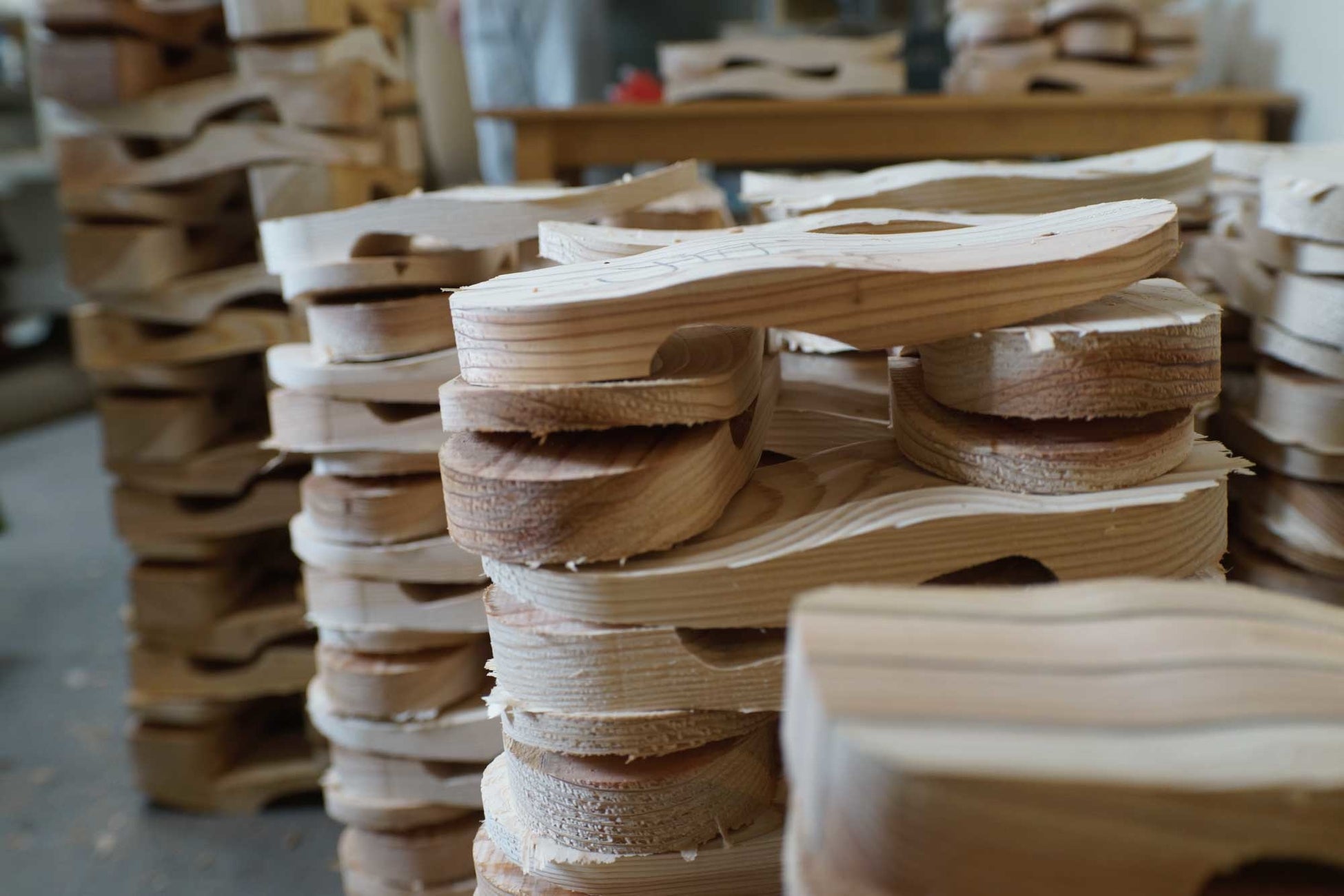 「神代焼き仕上げ」による木目の凹凸で、足裏に自然な隙間ができ、無塗装なので木の調湿機能を妨げることもなく足裏が快適です。日田杉は軽くて柔らかく、土踏まずのあたりが山なりの曲線状に削られており、足あたりも優しくなっています。